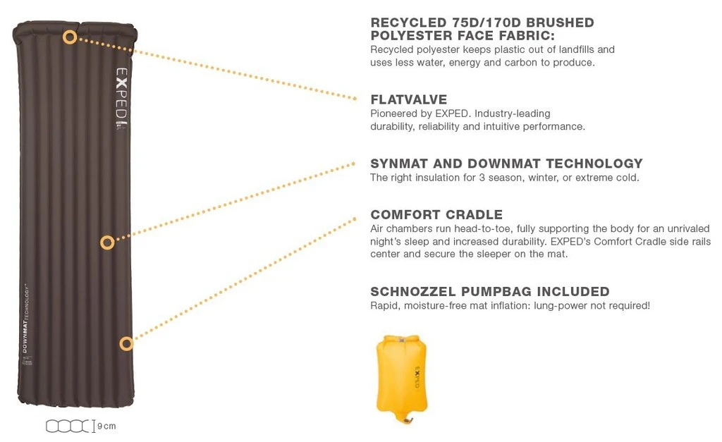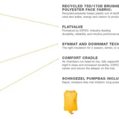 - Léger et robuste : les matériaux utilisés (polyester 75 deniers recylcé) permet à Exped de proposer un matelas léger et robuste.