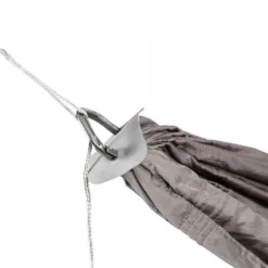 Hamac livré avec le système d’attache « Drip Clips » : il s’agit de mousqueton équipés d’une goutière. En cas de pluie, la gouttière empêche l’eau de ruisseler le long des suspentes et de détremper le hamac.