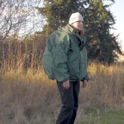 Imperméable et respirant, il est fabriqué à base d’un tissu en nylon ripstop résistant et durable. Les coutures sont étanchéifiées par un enduit en silicone. Il fait office de coupe-vent et est doté d’une capuche réglable.