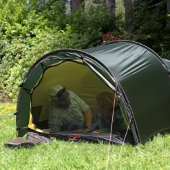 Le double-toit et la chambre sont prémontées pour une installation rapide. Lorsqu’il pleut, il est possible de monter le double-toit en premier pour garder la chambre au sec, et inversement au démontage. Le double-toit peut être utilisé seul pour obtenir un grand abri.