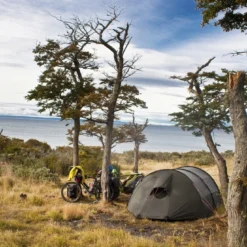 L’espace intérieur est confortable, spacieux et offre la même hauteur sous plafond sur toute la longueur de la tente. La Keron 3 dispose de 2 absides, une principale à l’avant au niveau de la porte et une secondaire à l’arrière pour le stockage du matériel. L’abside peut être ouverte entièrement pour bénéficier d’un accès plus facile. Le système de ventilation est constitué d’ouverture à l’avant et à l’arrière de la tente. La distance entre la chambre et le double toit permet une bonne circulation de l’air.