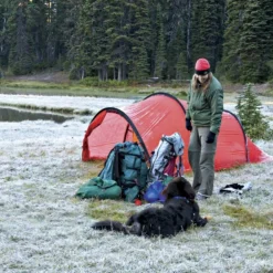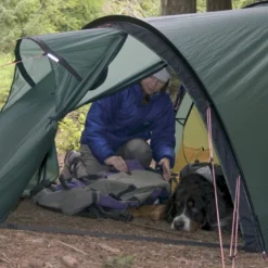 L’Hilleberg Nallo 3 GT est facile à monter. Elle dispose de 3 arceaux dont 1 signalé avec un code couleur rouge. Aux extrémités les arceaux sont de tailles identiques. Au milieu, il suffit de glisser le plus grand des arceaux dans le fourreau. La tente tunnel tient débout avec 4 piquets. Par mauvais temps, il est prévu de pouvoir fixer la tente Hilleberg Nallo 3 GT à 20 points d’amarrage.