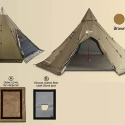 Le double-toit compte trois fenêtres de ventilation munies de moustiquaire, il est possible de les ouvrir ou fermer à sa guise depuis l’intérieur. Deux sont situées en bas et une sur la partie sommitale. Il compte deux grandes portes dotées de panneaux en tissu moustiquaire. Une jupe de neige fait le tour du tipi et sur la partie haute se trouve une trappe pour un conduit de cheminée lors de l’utilisation d’un poêle à bois (non fourni). Elle dispose de deux panneaux qui se fixent par bande velcro. Un premier pour fermer l’ouverture et un second en fibre de verre siliconé pour être utilisé avec une cheminée.