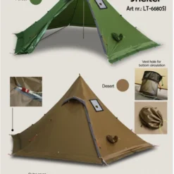 Il est réalisé dans les matériaux en nylon 260T silicone/PU de 40 derniers. Ce tipi est en plus équipé d’une jupe de à neige, d’une trappe pour la cheminé du poêle à bois (non fourni) et d’une ouverture tubulaire pour optimiser la ventilation.