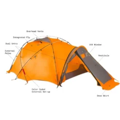 - La tente dispose de nombreux points d’amarrage pour supporter les vents violents et le poids de la neige.