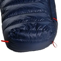 L’enveloppe est réalisée avec un tissu ultraléger et respirant, du Toray Airtastic SLF15 DWR, formant un cloisonnement en Z. Les parois inclinées entre les chambres permettent une meilleure isolation par rapport une construction en H classique. La fermeture éclair YKK est très fluide et elle ne se coince pas au contact du l’enveloppe du sac de couchage.