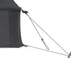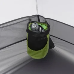 La housse de rangement se décompose en 3 compartiments, afin de pouvoir répartir le poids entres les personnes, mais aussi pour séparer la chambre du double-toit (utile lorsque double-toit n’est pas totalement sec). Elle a été pensée pour servir de poches de rangement dans la tente et de « lightbar » plafonnière (à combiner avec sa lampe).
