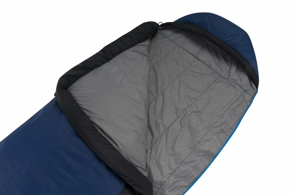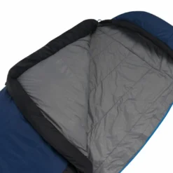 Sa forme fuselée et quasi-rectangulaire assure un confort accru et une grande liberté de mouvement. La longue fermeture éclair permet de transformer le sac de couchage en grande couette.