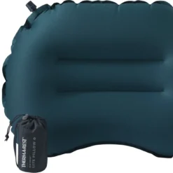 L’Air Head Lite Pillow de Thermarest est un coussin gonflable conçu avec un revêtement en polyester 30 deniers extensible, doux et agréable au toucher. Il ne pèse que 59 g (en taille R) et offre toutefois une belle surface de support pour la tête. Une fois plié, il se range facilement et ne prend pas de place dans une poche de sac à dos. Son épaisseur de 10 cm, sa forme arrondie et ergonomique le rend très confortable.