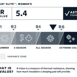 Le NeoAir XLite est un tapis de sol 4 saisons avec une isolation performante obtenue grâce Ă l’utilisation de barrières rĂ©flĂ©chissantes Ă l’intĂ©rieur du matelas. Ces feuilles d’aluminium permettent une convection de la chaleur. La chaleur est emprisonnĂ©e dans les boudins et est rĂ©flĂ©chie vers votre corps ! Ce procĂ©dĂ© permet de stopper le froid venant du sol. En taille 119, 183 et 196 cm le matelas a une rĂ©sistance thermique R-Value de 4.2, calculĂ©e avec la nouvelle norme ASTM F3340-18. Le modèle femme de 168 cm est dotĂ© d’une isolation plus importante et dispose d’un R-Value de 5.4, ce qui en fait un matelas 4 saisons. Pour cela, il est composĂ© de deux feuilles d’aluminium rĂ©flĂ©chissantes (au lieu d’une) et de tois niveaux de chambre Ă air dans les boudins.Â