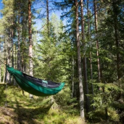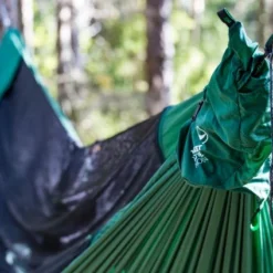 La ligne de crête intégrée permet de garder une forme confortable et de fixer le sac de rangement. Hamac réalise en nylon 20 deniers respirant et à séchage très rapide.