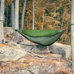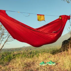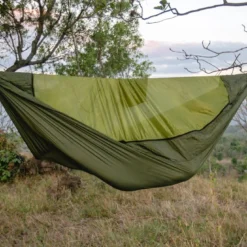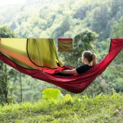 La ligne de crête intégrée permet de garder une forme confortable et de fixer le sac de rangement. Hamac réalise en toile de parachute ultra résistante et agréable au toucher.